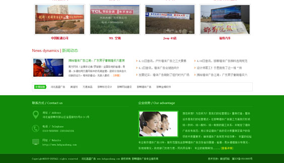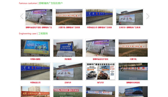 公司成立以來,與中國移動、中國聯通、中國電信、中國人壽、泰康人壽、平安保險,華北制藥,神威制藥,邯鄲都市婦科醫院,邯鄲瑪利亞醫院,邯鄲蘊育醫院,美的集團,康佳集團,TCL電器,江淮汽車,吉利汽車,東風汽車,長安汽車,豐田汽車,雪鐵龍汽車,啟辰汽車,五菱汽車,萬合集團等近千家國內大型集團公司長期合作。公司業務覆蓋東北三省,河北,河南,山東,山西,湖北,湖南,廣西,云南,江西,江蘇浙江,安徽等全國大部份省市,每月可完成50萬平方的廣告任務。