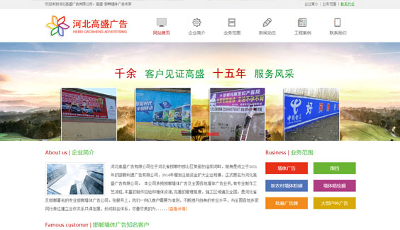 服務內容:墻體廣告、戶外墻體噴繪、大型墻體粉刷、村鎮及廠區墻體美化,和批量墻體廣告牌,施工區域逐年擴展,除有一支強有力的專業美工設計隊伍外,在工程項目施工過程中均采取技術質量指標化、標準化,特殊要求特殊制作的方式。并在實踐中形成了統一供料、統一制版、統一制作、統一驗收四個統一標準。以確保墻體廣告的質量和視覺沖擊效果。