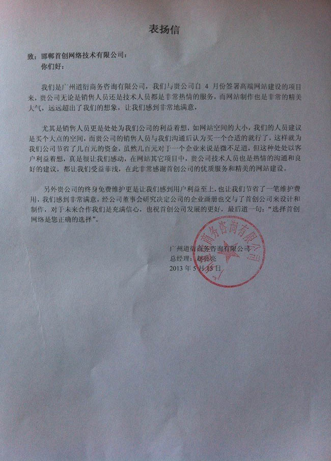 日前,我公司收到道衍商務咨詢有限公司的表揚信,在信中對首創(chuàng)公司的網(wǎng)站建設和服務給予了充分肯定和表揚。我們也感謝道衍公司的表揚,我們會繼續(xù)堅持為新老客戶提供優(yōu)質的服務,也希望在未來的道路上,與道衍公司合作的更加完好。